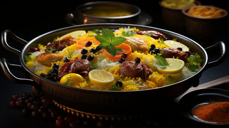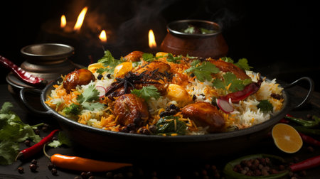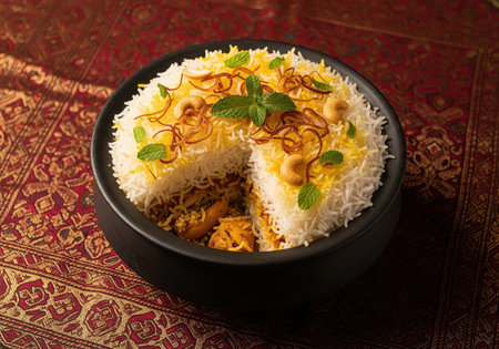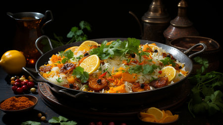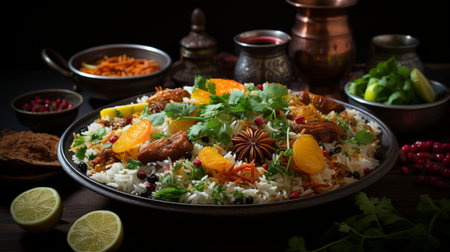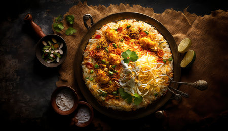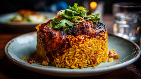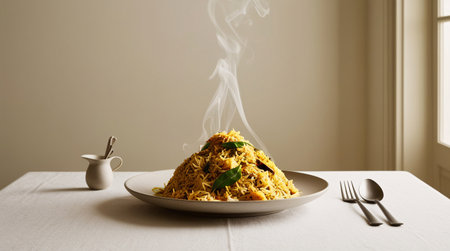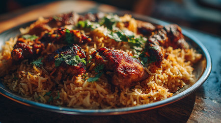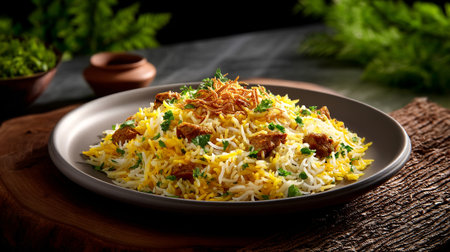 Indulge in a vibrant biryani dish beautifully plated with aromatic spices and fresh ingredients, capturing the essence of culinary artistry in a cozy kitchen.