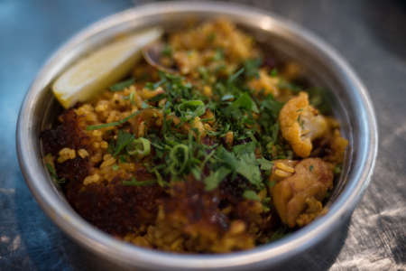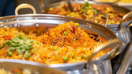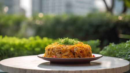 Capture the essence of Indian street food with this close-up shot of Biryani, a fragrant rice dish with meat or vegetables. The dish features basmati rice, layered with tender pieces of chicken or lamb, and an assortment of colorful vegetables and spices, including saffron, cinnamon, cardamom, and cumin. Garnished with fresh mint leaves and served with a side of cooling yogurt raita, this dish is perfect for a lively and festive mood. The bright, natural lighting and vibrant colors of the street food scene add to the lively atmosphere.