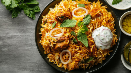 This vibrant plate features aromatic biryani topped with fresh mint and accompanied by yogurt and pickles, creating a delicious culinary experience.