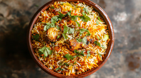 A stunning overhead view of a vibrant rice dish featuring chicken pieces and fresh herbs, carefully arranged in a traditional clay bowl for an appetizing display.