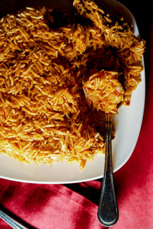 Rice with chicken and vegetables on a dark background. Selective focus.