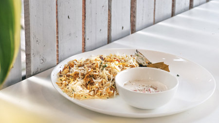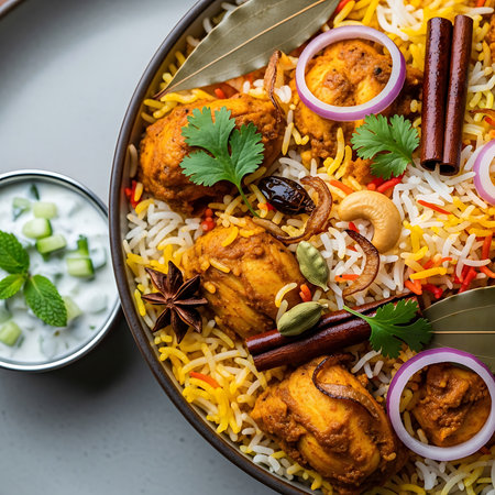 Aromatic chicken biryani served with a side of cucumber raita, perfect for food and restaurant concepts