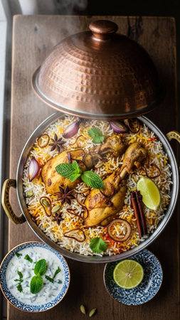 Aromatic chicken biryani served in a traditional copper pot with rice, spices, and herbs, accompanied by raita and lime.