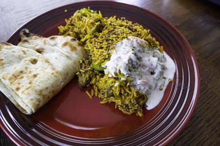A closeup shot of a delicious Indian Hyderabadi biryani with curd and salad