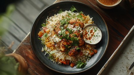 Delicious Chicken Biryani Presentation With Accompaniments on a Rustic Wooden Table