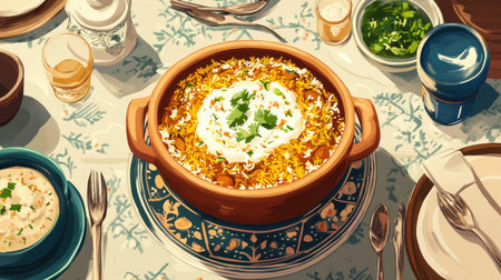 A serene table setting featuring a homemade biryani, served in a traditional clay pot with raita on the side, evoking the warmth of a family meal.