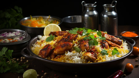 Chicken biryani dish with fragrant basmati rice and flavorful spices, ready to serve