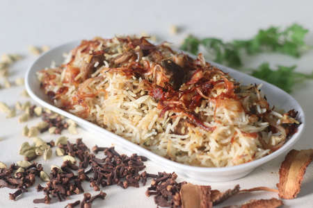Mutton Biryani. A dish cooked with spices layered between mildly spiced ghee rice with a generous sprinkle of caramelized onions and Mutton marinated in yogurt. Sot with lots of spices around