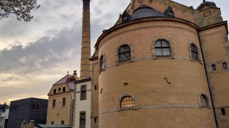 BAUTZEN, GERMANY - OCTOBER 10, 2019: Panoramic view of the town (apartment building, bridge and Spree river) from the height of the old Waterworks tower. Lens flare.