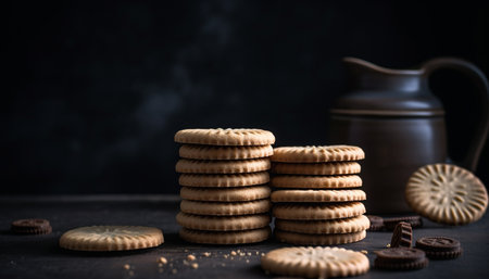 Cookies stacked on a dark surface with crumbs scattered around, perfect for dessert or snack time