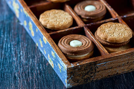 Delicious cream-filled cookies on a rustic wooden table attractively arranged for a sweet treat