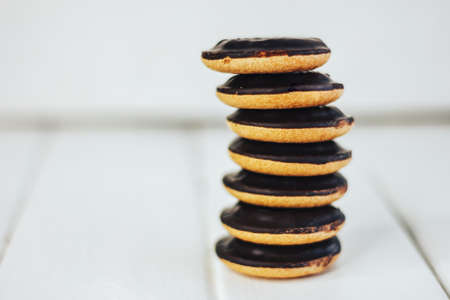 Cookie stack on a white wooden background. Round biscuits in chocolate glaze. Stands on each other