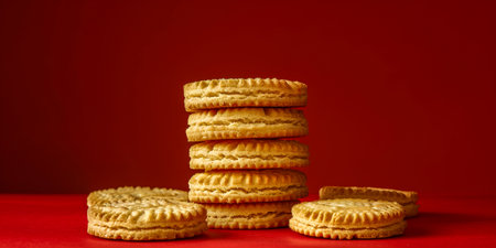 A stack of cookies on a red background.