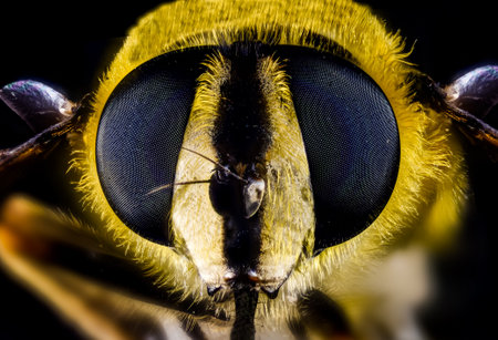 Macro shot of the head of a bee with yellow eyes.