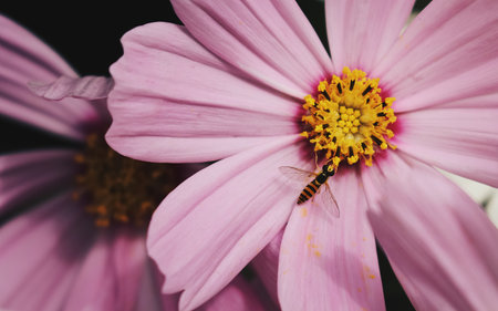 Bee on pink flower in the night. Shallow depth of field