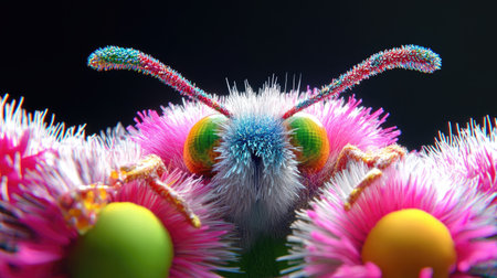 This captivating macro close-up showcases a vibrant furry insect with colorful features, surrounded by striking floral elements. Ideal for nature enthusiasts.