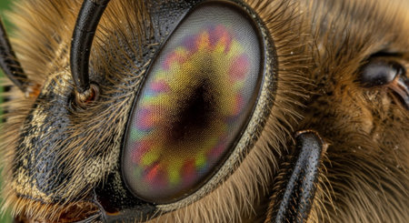 A detailed view of a bee highlighting its eyes, fur, and vibrant colors.