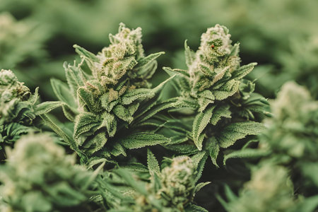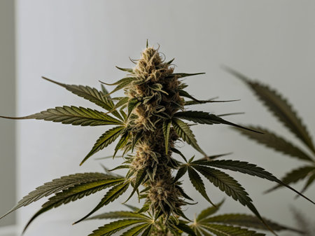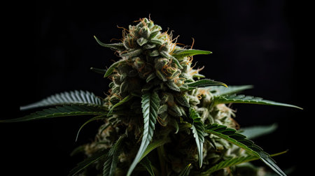 Marijuana plant in full bloom. Leaves are vibrant green. Depiction of the plant growth and development. Medical marijuana cannabis. Use of cannabinoids to treat diseases or relieve symptoms. AI.