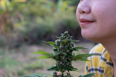 Asia woman smelling marijuana flower at the cannabis plantation