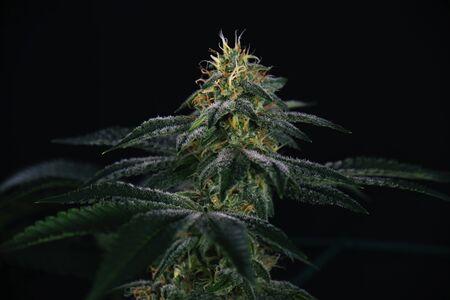 Beautiful blooming marijuana bud on black background, medicinal marijuana, the advantages of using cannabis for health reasons