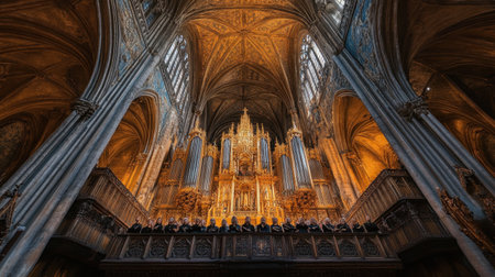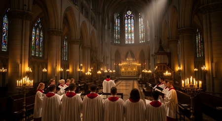 A majestic cathedral interior with a choir in harmony, illustrating the deep connection between music and religious devotion