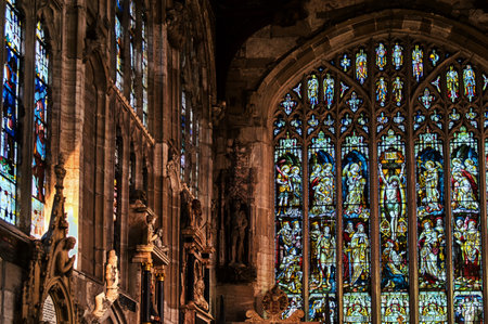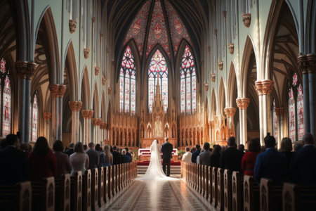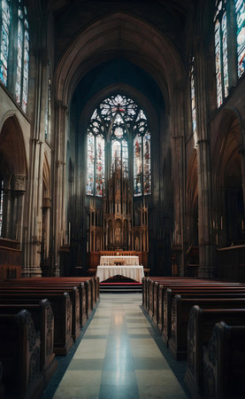 Majestic Interior of a Historic Church with Ornate Gothic Architecture and Vibrant Stained Glass Windows Creating a Serene and Spiritual Atmosphere for Worship and Devotion
