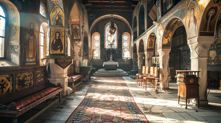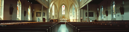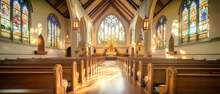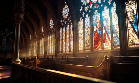 Sunlight pours through intricate stained glass windows, filling the beautiful church interior with an enchanting glow. The majestic space.