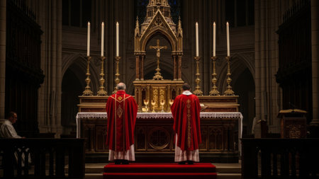 Priests in red robes at altar, gothic cathedral, religious ceremony