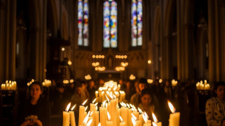 A congregation in a cathedral lighting candles in a solemn, dimly lit ceremony.
