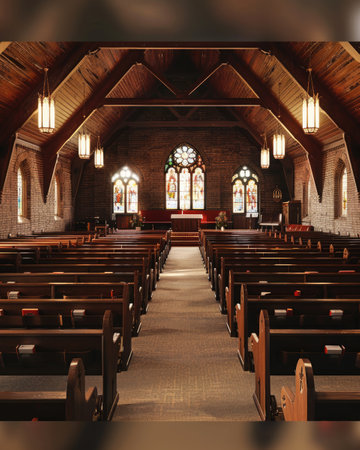 Experience the tranquility of a traditional church interior. This serene space features wooden benches, elegant architecture, and warmth from natural light, inviting reflection.