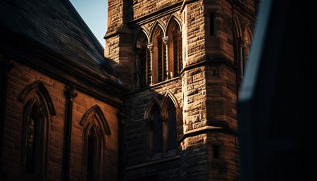 Medieval Gothic architecture illuminates stained glass windows of ancient basilica generated by artificial intelligence