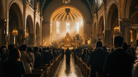 Softly illuminated interior of a grand church during evening service with warm lighting