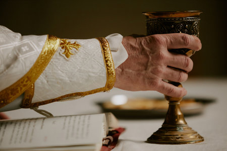 detail of a catholic priest serving mass at a liturgy. Images shows various symbols of catholicism, religious values and objects. Religion religious theme and concept with variety of symbolic church references.