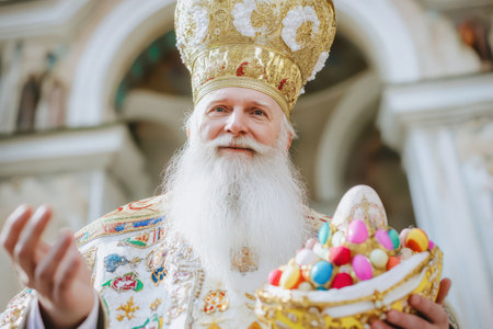 A priest holds a basket of colorful Easter eggs dressed in ornate ceremonial clothing smiling against a historic backdrop during the festive season.
