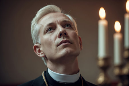 Pensive priest in liturgical vestments immersed in reading a sacred text by candlelight inside a church