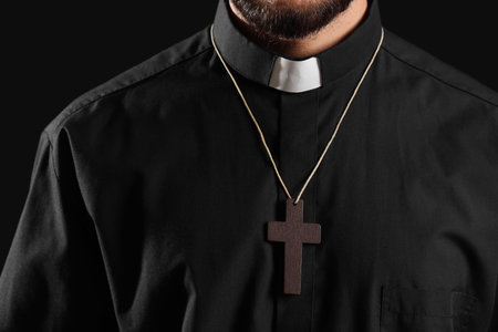 Priest with bible on black background. God religion cross, church pastor. Generate Ai