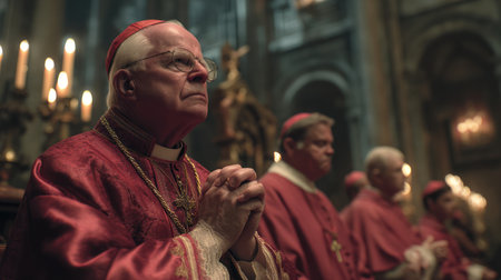 Several cardinals, dressed in red robes and mitres, are kneeling in prayer within a grand, dimly lit cathedral. The clergymen are focused on a central figure, who is looking upwards. Candles illuminate the scene, casting long shadows and highlighting the rich textures of the robes and the architectural details of the church. The overall atmosphere is solemn and reverent, suggesting a moment of deep contemplation and devotion.