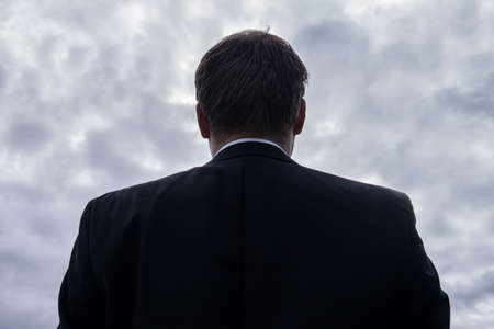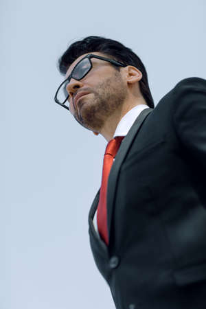 The young boss raises his hand and looks at the sky. Businessman looking at something on the horizon