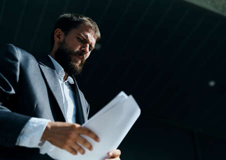 Handsome elegant sales representative in suit waiting for director of company. Man standing in office