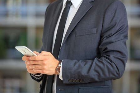 Close up hand of businessman with mobile phone. Concept of technology for business.