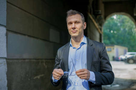 Businessman in a blue jacket stands against the backdrop of a modern building with large windows