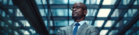 Confident, professional man in a suit, exuding experience and wisdom in a modern setting