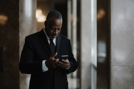 Senior executive engaging in business communication via smartphone while navigating a modern corporate office environment