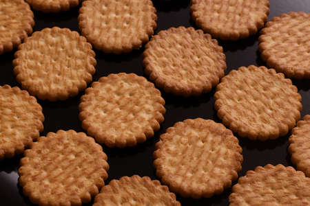 biscuits lying in rows on a black lacquered surface close-up