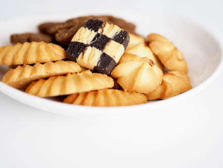 Homemade chocolate hearth shaped cookies and butter cookie on white background