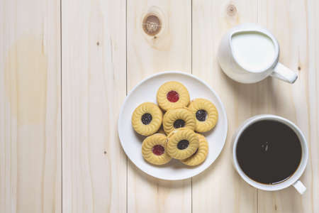 Coffee biscuits and milk over wooden background