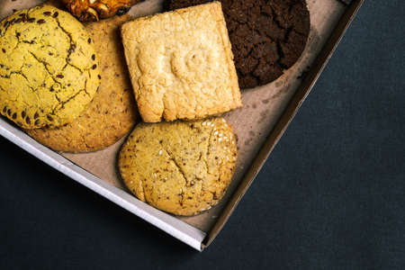 Cardboard box with homemade cookies. Festive cookies in a box. A sweet gift for Christmas, birthday and anniversary. Pastry. Cooking at home, a simple delicious recipe