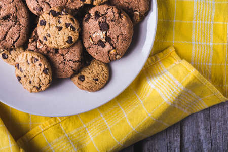 Chocolate chip cookies shot on white colored cloth, vintage style.