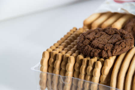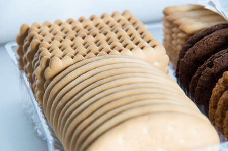 Tasty crackers close up in the box. Cookies background