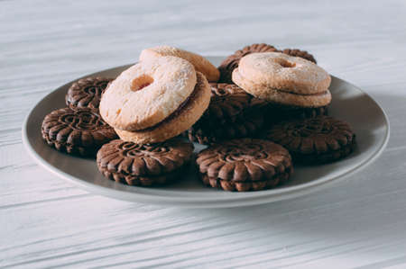 Sandwich biscuits, Cream biscuits, Cookies with cream filling on wooden table